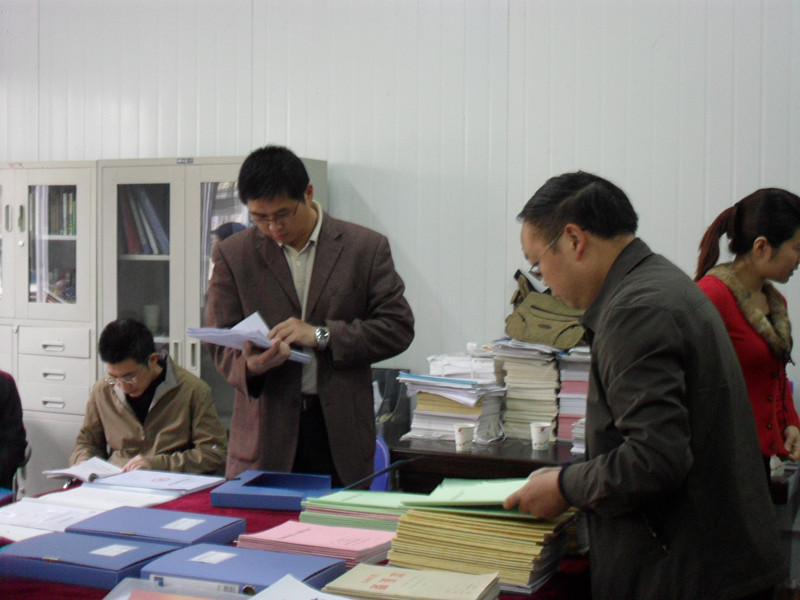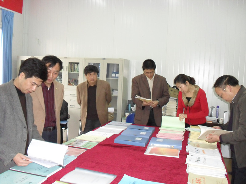 检查组成员在期中教学检查工作汇报现场,查阅了外语系各个教研室提供的学生作业、教案、讲稿、听课记录,以及教研室活动的各种书面汇报材料。