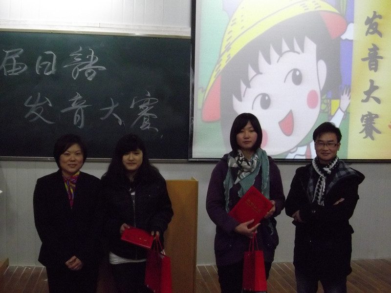 首先,选手们按顺序上台读单词和句子,老师进行评分。朗读结束后,11级同学合唱了一首温婉动听的日文歌曲,09级和10级的部分同学也上台即席表演助兴。分数统计完毕后,主持人宣布了本次大赛获奖名单,评委们分别为获奖学生颁发奖状和奖品。最后,集体合影留念。在这次比赛中,11级新生表现出色,大多学生发音准确,音节停顿到位,句子朗读流畅,赢得了阵阵的掌声。参加表演的同学们的唱功深厚,舞台表现极富魅力,现场气氛庄重而活跃。
