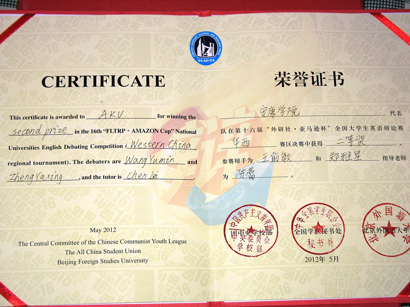 6月3日,历时四天的第十六届“外研社•亚马逊杯”全国大学生英语辩论赛华西赛区决赛在西安电子科技大学圆满落幕。由外语系王俞敏和郑雅星同学组成的代表队,在外语系教师陈蕾的指导下,经过五轮循环赛的艰苦拼搏,最终斩获华西赛区二等奖;同时,学校获得“优秀组织奖”。这是我校首次参加全国性大学生英语辩论赛。