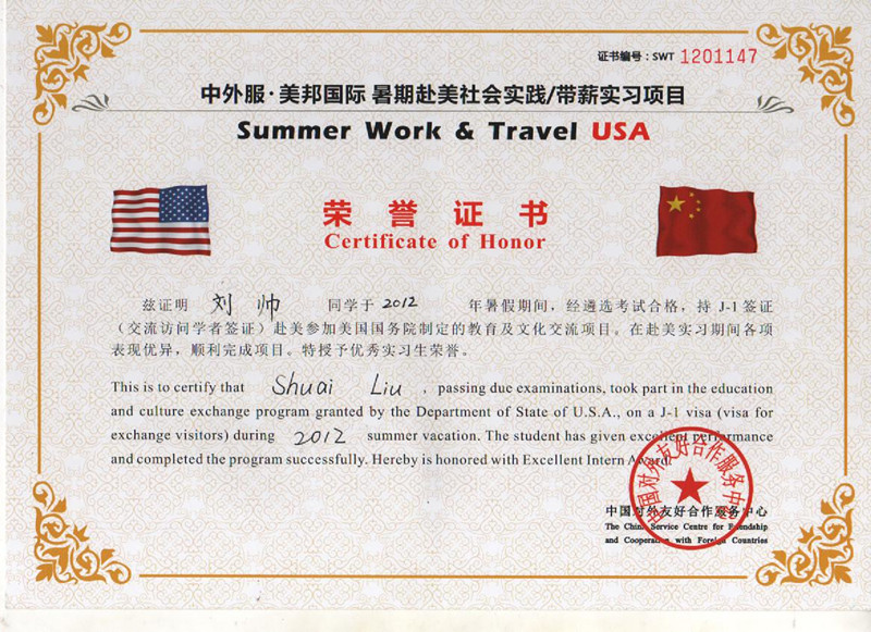 今年6月,我系选派了英语2009级刘帅、孔若曦等两名同学,参加由我校国际合作与交流处组织的在校大学生“暑期赴美带薪实习项目”。目前,两名学生荣获“优秀实习生”,圆满结束实习,顺利返校。