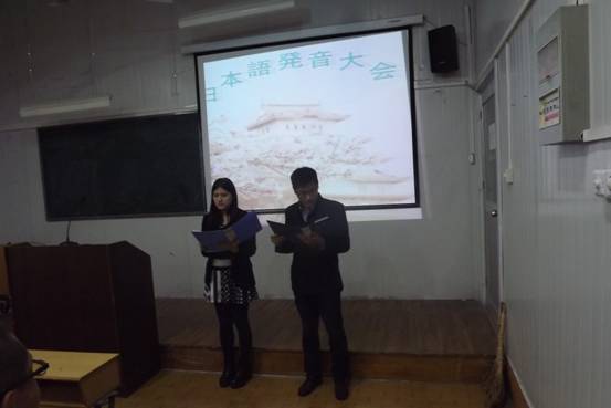 为了培养日语专业新生的学习兴趣,锻炼和提高日语发音和口语表达能力, 12月16日晚,日语教研室在6405教室举办了第三届日语发音比赛。参加本次比赛的选手为日语专业一年级全体同学,莅临本次大赛的嘉宾有组织部胡波部长、外语系李延福书记,评委老师为日语专业赤松秀夫、陈玉平、刘婷、梁维、王庚老师。另外本专业大二、大三的部分同学也参与了本次活动。