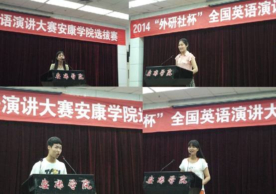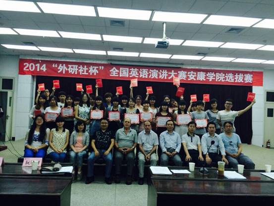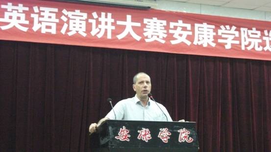 6月13日晚,2014“外研社杯”全国英语演讲大赛安康学院选拔赛在图书馆六楼报告厅隆重举行。大赛评委由我校外籍教师Raymond John Dennison和Frank Paul Roppo,以及外语系七位教师组成。教务处副处长常权记、外语系主任哈红光、大学英语教学部主任李继平、外语系副主任张哲华莅临大赛。