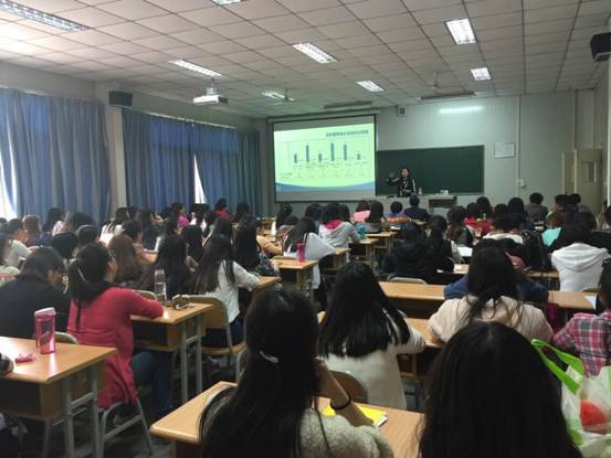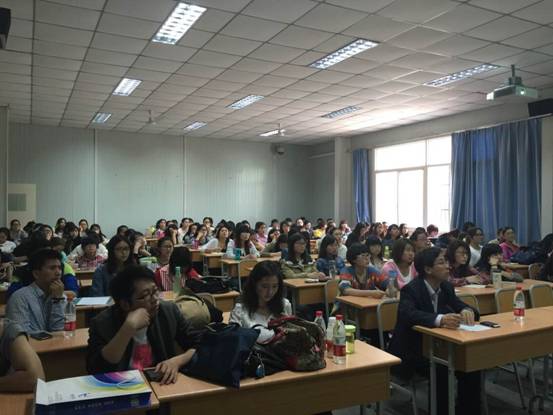 在随后的宣讲会上,来自中国译协的长孙老师围绕翻译职业前景、LSCAT项目分阶段测评、口译笔记等方面向同学们展开讲述。