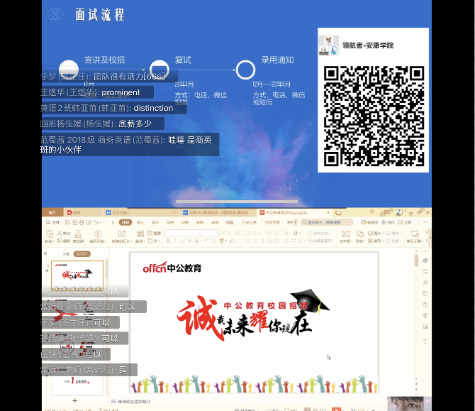 本次线上招聘宣讲会主要邀请的企业有广州领航者信息科技有限公司、陕西安康秦巴漫创玩具产业运营管理有限公司、义乌梦开进出口有限公司、中公教育科技有限公司安康分公和重庆诺维奇进出口贸易有限公司等五家单位。学院院长张哲华、辅导员常远红、李梦以及2022届全体毕业生参加此次招聘会。