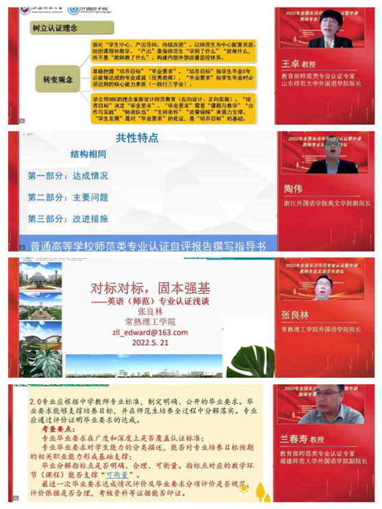 教育部师范专业认证专家、福建师范大学外国语学院副院长蓝春寿教授分享了师范专业认证专家组进校考查的流程和注意事项;常熟理工学院外国语学院院长张良林分享了英语师范专业二级认证的实例;浙江外国语学院英文学院副院长陶伟分享了师范专业认证自评报告的撰写方法。