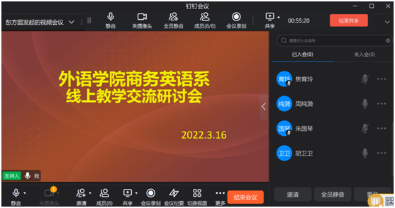 为落实陕西省教育厅及学校疫情防控要求,我院于3月14日全面展开线上教学。为保障线上教学效果,在做好线上教学的同时,我院商务英语系积极开展线上教研活动,3月16日,副院长胡卫卫及商务全系教师共同进行线上教学交流研讨。